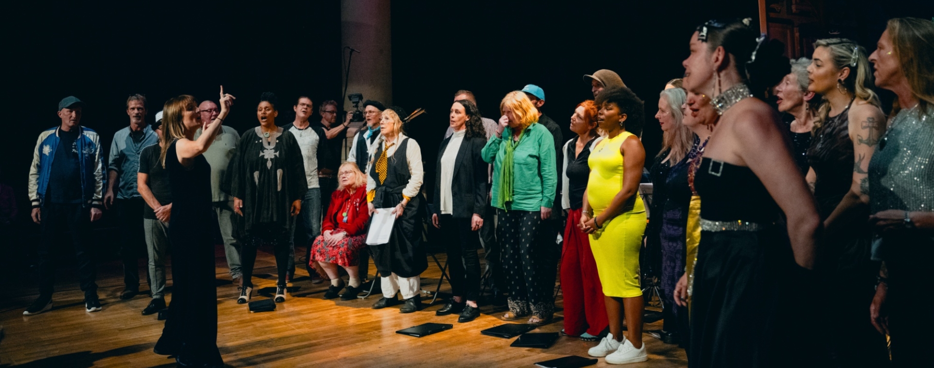 The choir standing in a U shape singing during their performance at the Creative Communities Summer Showcase at Bristol Beacon
